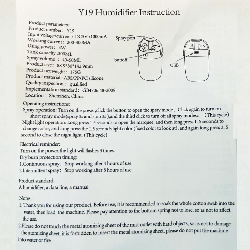 دستگاه رطوبت ساز دارای کابل usb می باشد. عملکرد اسپری: پس از روشن کردن ، اندکی صبر کنید تا فیلتر آب مقطر ( یا تصفیه ) داخل مخزن را به خود جذب کند. اولین فشار کوتاه دکمه ، حالت اسپری مداوم و فشار کوتاه بعدی دکمه، حالت اسپری پالسی سه ثانیه ای و فشار کوتاه بعدی دکمه ، اسپری را خاموش می کند.عملکرد نور شبانه: با فشار دکمه ی on / off ، نور های رنگی روشن می شود و با نگه داشتن این دکمه ، میزان نور کم یا زیاد می شود. ( دستور العمل کامل در کاتولوگ موجود است.).در حالت اسپری مداوم پس از 4 ساعت و در حالت اسپری پالسی پس از 8 ساعت به طور اتومات خاموش میشود. فقط تا 90% از مخزن پر شود. و درون مخزن ، آب داغ ریخته نشود.