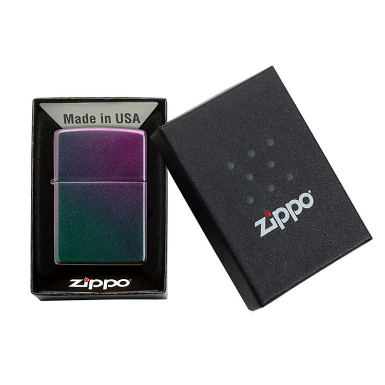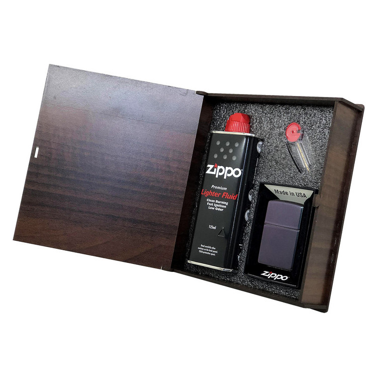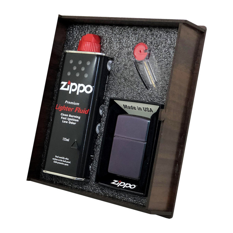 جعبه هدیه چوبی زیپو به همراه فندک اصلی زیپو کد ۴۹۱۴۶ – Zippo Reg Iridescent Matte و بنزین زیپو و سنگ فندک